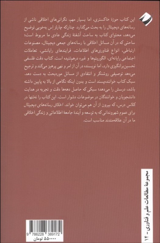 اين کتاب حوزهي خاکستري، اما بسيار مهم، نگرانيهاي اخلاقي ناشي از رسانههاي ديجيتال را به بحث ميگذارد. چنانکه چارلز اِس بهخوبي توضيح ميدهد، محتواي کتاب به ساحت آشفتهي زندگي عادي ما مربوط است؛ ساحتي که در آن مسائل اخلاقي با رسانههاي جمعي ديجيتال، مصنوعات ارتباطي، انواع فناوريهاي اطلاعات، فرايندهاي رايانشي، تعاملات ارتباطي رايانهاي، الگوريتمها و غيره درهمتنيده است. کتاب دقت فلسفي تحسينبرانگيزي دارد، اما نويسنده در آن از امر و نهي پرهيز ميکند و ترجيح ميدهد توصيفي روشنگر و انتقادي از مسائل موردبحث به دست دهد. سبک کتاب خوانندهپسند است و بدون اينکه نگاهي از بالا به پايين داشته باشد، درسش را ميدهد؛ سبکي که حاصل دههها دقت و تجربه در هدايت دانشجويان و خوانندگان در موضوعات دشوار است. اين کتاب را نهتنها در کلاس درس، که بيرون از آن هم ميتوان خواند. اخلاق رسانههاي ديجيتال براي عموم شهرونداني که به توسعه و آيندهي جامعهي اطلاعاتي و زندگي اخلاقي ما در آن علاقهمندند مناسب است.
