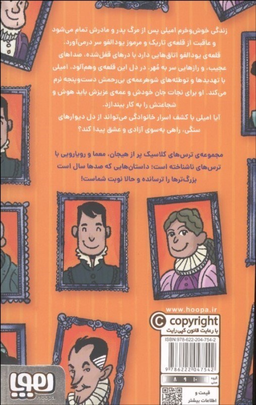 زندگي خوشوخرم اميلي پس از مرگ پدر و مادرش تمام ميشود و عاقبت از قلعهي تاريک و مرموز يودلفو سر درميآورد. قلعهي يودلفو اتاقهايي دارد با درهاي قفلشده، صداهاي عجيب، و رازهايي سربهمُهر. در دل اين قلعهي وهمآلود، اميلي با تهديدها و توطئههاي شوهرعمهي بيرحمش دستوپنجه نرم ميکند. او براي نجات جان خودش و عمهي عزيزش بايد هوش و شجاعتش را به کار بيندازد. آيا اميلي با کشف اسرار خانوادگي ميتواند از دل ديوارهاي سنگي، راهي بهسوي آزادي و عشق پيدا کند؟ مجموعهي ترسهاي کلاسيک پر از هيجان، معما و رويارويي با ترسهاي ناشناخته است؛ داستانهايي که صدها سال است بزرگترها را ترسانده! حالا نوبت شماست!