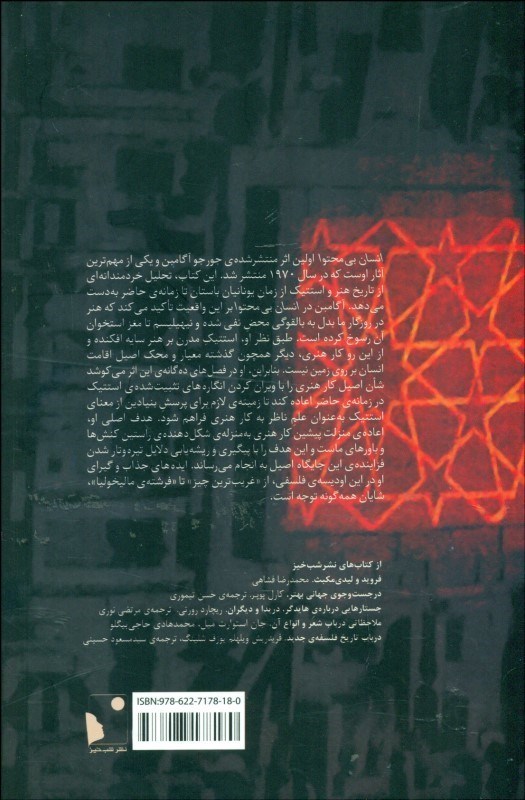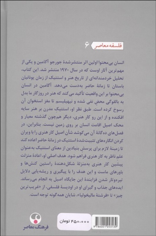 انسان بيمحتوا اولين اثر منتشر شدهي جورجو آگامبن و يكي از مهمترين آثار اوست كه در سال 1970 منتشر شد. اين كتاب تحليل خردمندانهاي از تاريخ هنر و استتيك از زمان يونانيان باستان تا زمانهي حاضر به دست ميدهد. آگامبن در انسان بيمحتوا بر اين واقعيت تاكيد ميكند كه هنر در روزگار ما بدل به بالقوگي محض نفي شده و نيهيليسم تا مغز استخوان آن رسوخ كرده است.