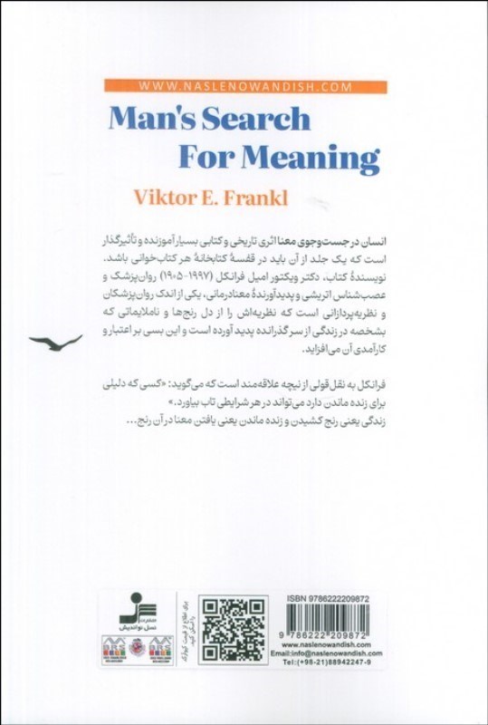 "انسان در جستوجوي معنا" اثري تاريخي و کتابي بسيار آموزنده و تأثيرگذار است که يک جلد از آن بايد در قفسه کتابخانه هر کتابخواني باشد.