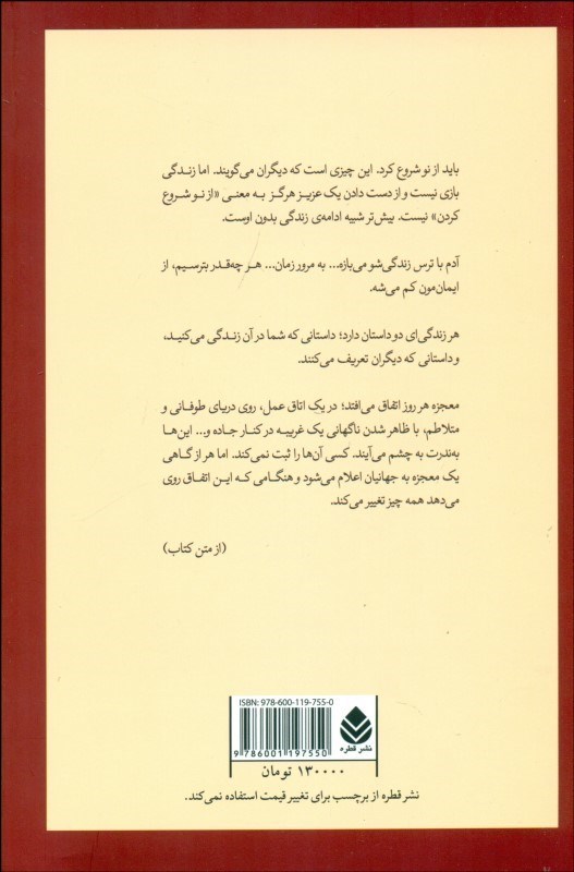 بايد از نو شروع كرد. اين چيزي است كه ديگران ميگويند. اما زندگي، بازي نيست و از دست دادن يك عزيز هرگز به معني «از نو شروع كردن» نيست. بيشتر شبيه ادامه زندگي بدون اوست. آدم با ترس زندگيشو ميبازه... به مرور زمان... هر چهقدر بترسيم، از ايمانمون كم ميشه. هر زندگي دو داستان دارد؛ داستاني كه شما در آن زندگي ميكنيد، و داستاني كه ديگران تعريف ميكنند. معجزه هر روز اتفاق ميافتد؛ در يك اتاق عمل، روي درياي طوفاني و متلاطم، يا ظاهر شدن ناگهاني يك غريبه در كنار جاده و... اينها به ندرت به چشم ميآيند. كسي آنها را ثبت نميكند. اما هر از گاهي، يك معجزه به جهانيان اعلام ميشود و هنگامي كه اين اتفاق روي ميدهد، همه چيز تغيير ميكند.