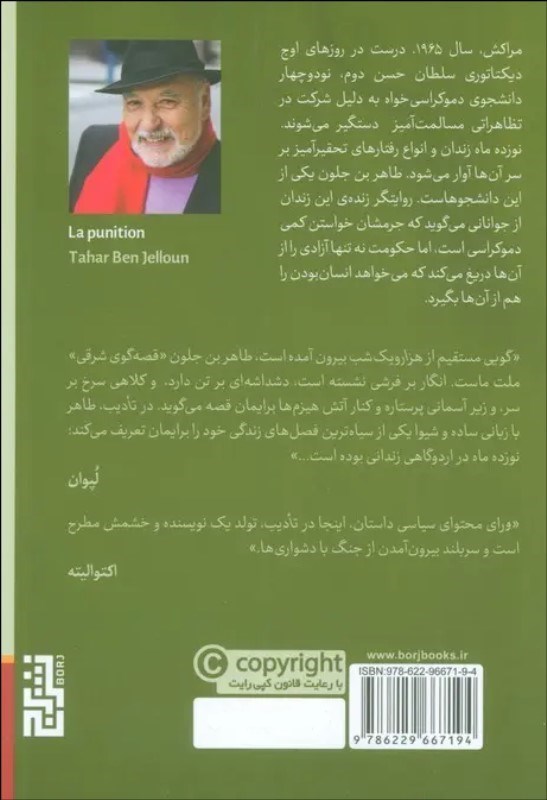 «گويي مستقيم از هزارويک شب بيرون آمده است، طاهر بن جلون «قصه گوي شرقي» ملت ماست. انگار بر فرشي نشسته است، دشداشه اي بر تن دارد، و کلاهي سرخ بر سر، و زير آسماني پرستاره و کنار آتش هيزم ها برايمان قصه ميگويد. در تأديب، طاهر با زباني ساده و شيوا يکي از سياهترين فصلهاي زندگي خود را برايمان تعريف ميکند؛ نوزده ماه در اردوگاهي زنداني بوده است...»