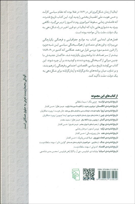 ايتاليا از زمان شکلگيرياش در 1861 در تقلا بوده که نظام سياسي کارآمد و حس هويت ملي اطمينانبخشي را پديد آورد. اين کتاب تاريخ فشرده، که فاصلهي زماني سقوط امپراتوري روم تا امروز را دربر ميگيرد، نگاهي ويژه به دشواريهايي دارد که ايتاليا در دو قرن اخير در راه شکلدهي به يک دولت-ملت با آن مواجه بوده است.