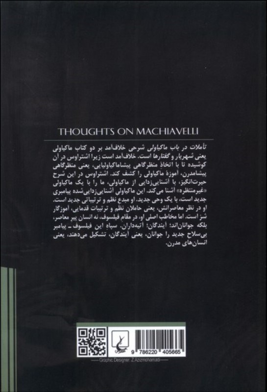 تأملات در باب ماکياولي شرحي خلافآمد بر دو کتاب ماکياولي يعني شهريار و گفتارها است. خلافآمد است زيرا اشتراوس در آن کوشيده تا با اتخاذ منظرگاهي پيشاماکياوليايي، يعني منظرگاهي پيشامدرن، آموز? ماکياولي را کشف کند. اشتراوس در اين شرح حيرتانگيز، با آشناييزدايي از ماکياولي، ما را با يک ماکياولي «غيرمنتظره» آشنا ميکند. اين ماکياولي آشناييزداييشده پيامبر جديد است، با يک وحي جديد. او مبدع نظم و ترتيباتي جديد است.