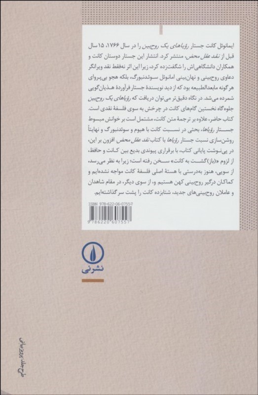 ايمانوئل کانت جستار رؤياهاي يک روحبين را در سال 1766، 15 سال قبل از نقد عقل محض، منتشر کرد. انتشار اين جستار دوستان کانت و همکاران دانشگاهياش را شگفتزده کرد، زيرا اين اثر نهفقط نقد ويرانگر دعاوي روحبيني و نهانبيني امانوئل سوئدنبورگ، بلکه هجو بيپرواي هرگونه مابعدالطبيعه بود که از ديد نويسندهي جستار فراوردهي هذيانگويي شمرده ميشد. در نگاه دقيقتر ميتوان دريافت که رؤياهاي يک روحبين جلوهگاه نخستين گامهاي کانت در چرخش به سوي فلسفهي نقدي است. کتاب حاضر، علاوه بر ترجمهي متن کانت، مشتمل است بر خوانش مبسوط جستار رؤياها، بحثي در نسبت کانت با هيوم و سوئدنبورگ و نهايتاً روشنسازي نسبت جستار رؤياها با کتاب نقد عقل محض. افزون بر اين، در پينوشت پاياني کتاب، با برقراري پيوندي بديع بين کانت و حافظ، از لزوم «(باز)گشت به کانت» سخن رفته است؛ زيرا به نظر ميرسد، از سويي، هنوز بهدرستي با هستهي اصلي فلسفهي کانت مواجه نشدهايم و کماکان درگير روحبيني کهن هستيم و، از سوي ديگر، در مقام شاهدان و عاملان روحبينيهاي جديد، شتابزده کانت را پشت سر گذاشتهايم.