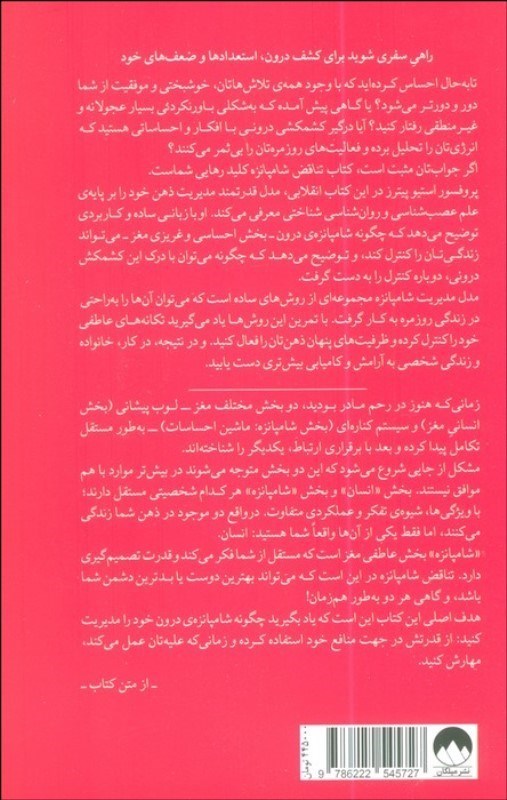 راهيِ سفري براي کشف استعدادها و ضعفهاي خود شويد. آيا تابهحال احساس کردهايد که عليرغم تلاشهايتان، خوشبختي و موفقيت از شما دور ميشود؟ يا گاهي اوقات، غيرمنطقي يا عجولانه فکر ميکنيد؟ آيا در کشاکش دروني بـا افکار و احساساتي هستيد که فعاليتهاي روزمرهتان را بيثمر ميکنند؟ اگر پاسخ شما مثبت است تناقض شامپانزه کليد رهايي شماست. پروفسور استيو پيترز در اين کتاب انقلابي، مدل قدرتمند مديريت ذهن خود را بر پايهي علم عصبشناسي و روانشناسي شناختي معرفي ميکند. او به زباني ساده و کاربردي توضيح مـيدهد کـه چگونه شامپانزهي درون، بخش احسـاسي و غـريزي مغز شما، ميتواند زندگيتان را کنترل کند. با درک اين کشمکش دروني، شما قادر خواهيد بود: • نحوهي کارکرد ذهن خود را بشناسيد؛ • احساسات و افکار خود را درک و مديريت کنيد؛ • موانع سد راهتان را براي رسيدن به زندگي شادتر و با موفقيتهاي بيشتر بشناسيد؛ • خود را مديريت کنيد و کسي شويد که دوست داريد باشيد. مدل مديريت شامپانزه روشهاي سادهاي دارد کـه ميتوان آنها را بهراحتي در زندگي روزمره گنجاند. بـه کمک اين روشها ميتوانيد تکانههاي عاطفي خود را کنترل کنيد و به موفقيت در کار و داشتن زندگي شادتر و سازگار با محيط خانواده برسيد.