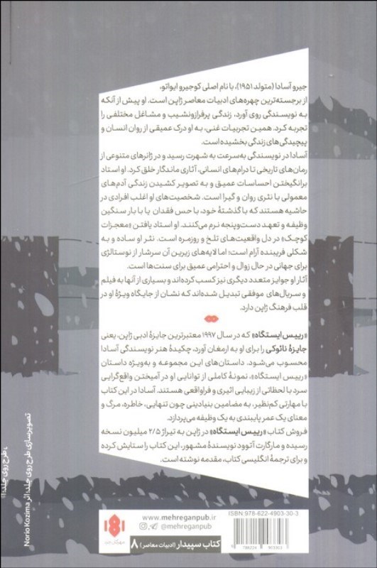 جيرو آسادا (متولد 1951)، با نام اصلي کوجيرو ايواتو، از برجستهترين چهرههاي ادبيات معاصر ژاپن است. او پيش از آنکه به نويسندگي روي آورد، زندگي پرفرازونشيب و مشاغل مختلفي را تجربه کرد. همين تجربيات غني، به او درک عميقي از روان انسان و پيچيدگيهاي زندگي بخشيده است. آسادا در نويسندگي بهسرعت به شهرت رسيد و در ژانرهاي متنوعي از رمانهاي تاريخي تا درامهاي انساني، آثاري ماندگار خلق کرد. «رييس ايستگاه» که در سال 1997 معتبرترين جايز? ادبي ژاپن، يعني جايز? نائوکي را براي او به ارمغان آورد، چکيد? هنر نويسندگي آسادا محسوب ميشود. داستانهاي اين مجموعه و بهويژه داستان «رييس ايستگاه»، نمون? کاملي از توانايي او در آميختن واقعگرايي سرد با لحظاتي از زيبايي اثيري و فراواقعي هستند. آسادا در اين کتاب با مهارتي کمنظير، به مضامين بنياديني چون تنهايي، خاطره، مرگ و معناي يک عمر پايبندي به يک وظيفه ميپردازد.