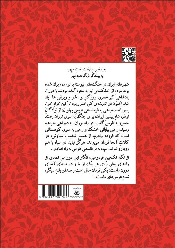 به بَد بَس درازَست دستِ سِپِهر به بيدادگَر بَرنگردد به مِهر شهرهاي ايران در جنگهاي پيوسته با توران ويران شده بود. مردم از خشکسالي نيز به ستوه آمده بودند. با دوران پادشاهيِ کيخسرو، روزگارِ نو آغاز و ويراني ها آباد شد. اکنون در انديشهي کيخسرو بود تا کينخواهِ خونِ پدر باشد. سپاهي به فرماندهي طوسِ پهلوان، از نوادگانِ نوذر، شاهِ پيشينِ ايران، براي جنگ به سوي توران رفت. خسرو به طوس گفت: در راه توران، به دوراهي خواهد رسيد، راهي بياباني خشک و راهي به سوي کوهستاني که فرود، برادرم، از همسرِ نخستِ سياوش، در کلاتِ آنجا فرمان ميراند، هرگز نبايد دو سپاه با هم روبهرو شوند. سپاه به فرماندهي طوس به راه افتاد و... از نگاهِ نکتهبينِ فردوسي، انگار اين دوراهي نمادي از راههاي پيشِ روي هر يک از ما و دو صداي آشناي درونِ ماست: يکي فرمانِ عقل است و صداي بلندِ ديگر، نمادِ هوسهاي ماست...
