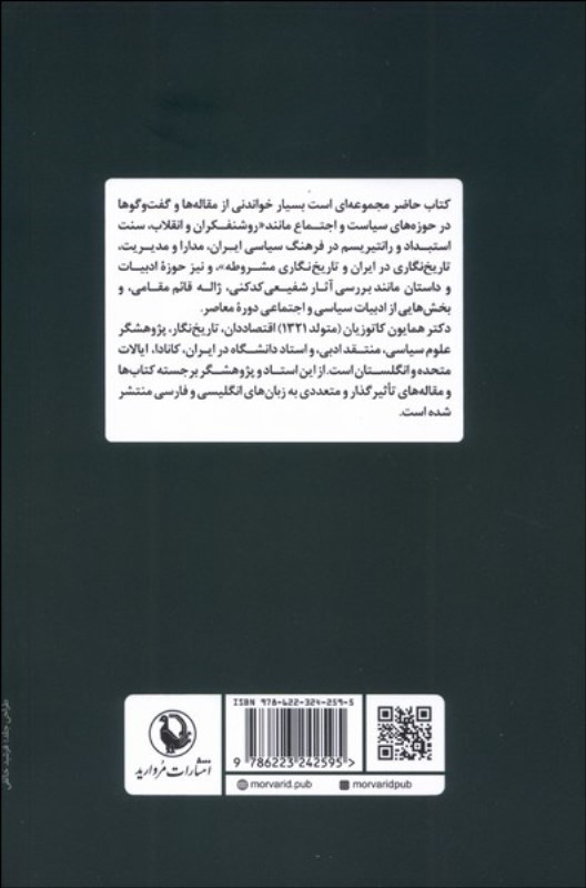 کتاب حاضر مجموعهاي است بسيار خواندني از مقالهها و گفتوگوها در حوزههاي سياست و اجتماع مانند روشنفکران و انقلاب، سنت استبداد و رانتيريسم در فرهنگ سياسي ايران، مدارا و مديريت، تاريخنگاري در ايران و دور? مشروطه، و نيز حوز? ادبيات و داستان مانند آثار شفيعيکدکني، ژاله اصفهاني، و بخشهايي از ادبيات سياسي و اجتماعي دور? معاصر. دکتر همايون کاتوزيان (متولد ????) اقتصاددان، تاريخنگار، پژوهشگر علوم سياسي، منتقد ادبي، و استاد دانشگاه در ايران، کانادا، ايالات متحده و انگلستان است. از اين استاد و پژوهشگر برجسته کتابها و مقالههاي تأثيرگذار و متعددي به زبانهاي انگليسي و فارسي منتشر شده است.