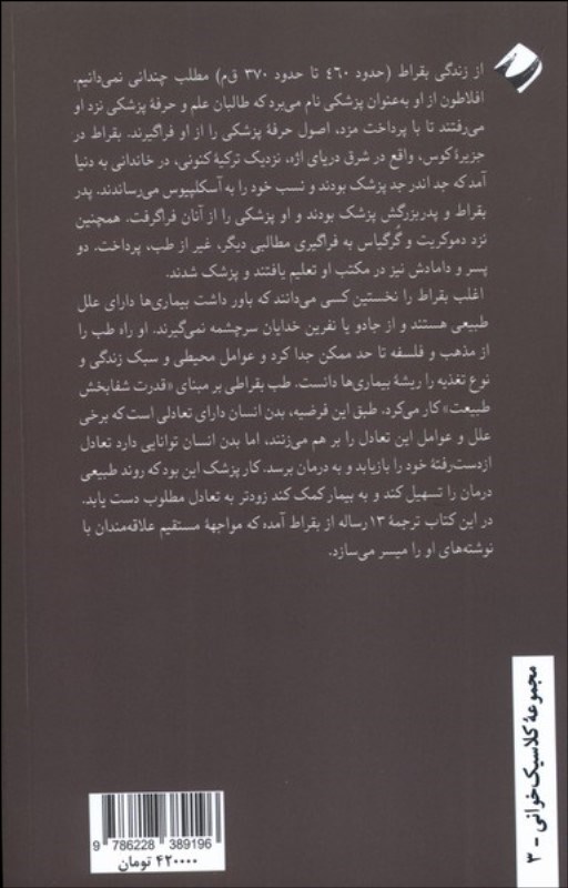 اغلب بقراط را نخستين کسي ميدانند که باور داشت بيماريها داراي علل طبيعي هستند و از جادو يا نفرين خدايان سرچشمه نميگيرند. او راه طب را از مذهب و فلسفه تا حد ممکن جدا کرد و عوامل محيطي و سبک زندگي و نوع تغذيه را ريش? بيماريها دانست. طب بقراطي بر مبناي «قدرت شفابخش طبيعت» کار ميکرد. طبق اين فرضيه، بدن انسان داراي تعادلي است که برخي علل و عوامل اين تعادل را بر هم ميزنند، اما بدن انسان توانايي دارد تعادل ازدسترفت? خود را بازيابد و به درمان برسد. کار پزشک اين بود که روند طبيعي درمان را تسهيل کند و به بيمار کمک کند زودتر به تعادل مطلوب دست يابد. در اين کتاب ترجم? 13 رساله از بقراط آمده که مواجه? مستقيم علاقهمندان با نوشتههاي او را ميسر ميسازد.