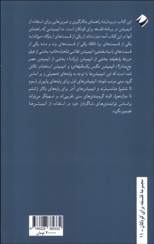 اين کتاب دربردارند? راهنماي بهکارگيري و تمرينهايي براي استفاده از انيميشن در برنام? فلسفه براي کودکان است. ده انيميشني که راهنماي آنها در اين کتاب آمده عبارتاند از يکي از قسمتهاي اردوگاه حيوانات؛ يکي از قسمتهاي بر? ناقلا؛ يکي از قسمتهاي پت و مت؛ يکي از قسمتهاي باباسفنجي؛ انيميشن نقاشي شاهزادهخانم؛ بخشي از فيلم مزرع? پامفيلد؛ بخشي از انيميشن شرک 1؛ بخشي از انيميشن عصر يخبندان 2؛ انيميشن مگس يکدقيقهاي؛ و انيميشن استخدام. تلاش شده است که اين انيميشنها به توجه به پايههاي تحصيلي و بر اساس گروه سني مرتب شوند: انيميشنهاي اول براي پايههاي پايينتر (سوم تا ششم) مناسبترند و انيميشنهاي آخر براي پايههاي بالاتر (ششم تا دوازدهم). البته گروهبنديهاي سني تقريبياند و تسهيلگر ميتواند بر اساس توانمنديهاي شاگردان خود در استفاده از انيميشنها تصميم بگيرد.