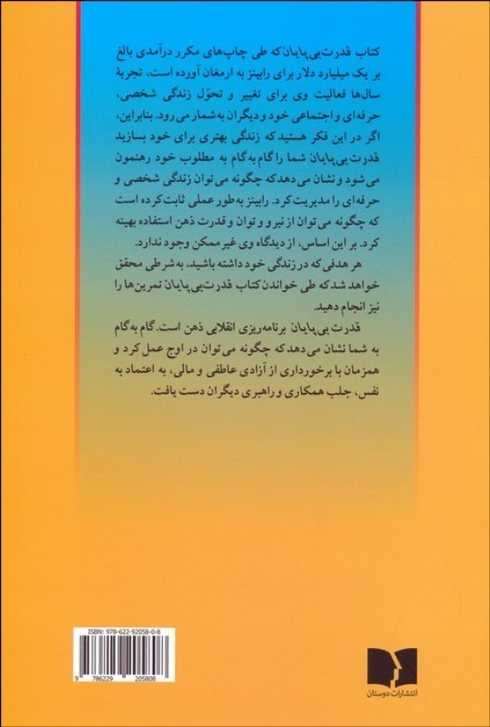 کتاب قدرت بيپايان، که طي چاپهاي مکرر و درآمدي بالغ بر يک ميليارد دلار براي رابينز به ارمغان آورده است، تجربه سالها فعاليت او براي تغيير و تحول زندگي شخصي، حرفهاي و اجتماعي خود و ديگران به شمار ميرود. بنابراين، اگر در اين فکر هستيد که زندگي بهتري براي خود بسازيد، قدرت بيپايان شما را گامبهگام به مطلوب خود رهنمون ميشود و نشان ميدهد که چگونه ميتوان زندگي شخصي و حرفهاي را مديريت کرد. رابينز به طور عملي ثابت کرده است که چگونه ميتوان از نيرو، توان و قدرت ذهن استفاده بهينه کرد. بر اين اساس، از ديدگاه وي غيرممکن وجود ندارد. هر هدفي که در زندگي خود داشته باشيد، به شرطي محقق خواهد شد که با خواندن کتاب قدرت بيپايان، تمرينها را نيز انجام دهيد. قدرت بيپايان برنامهريزي انقلابي ذهن است. گامبهگام به شما نشان ميدهد چگونه ميتوان در اوج عمل کرد و همزمان با برخورداري از آزادي عاطفي و مالي، به اعتماد به نفس، جلب همکاري و راهبري ديگران دست يافت.