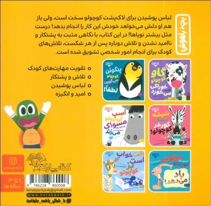 لباس پوشيدن براي لاکپشت کوچولو سخت است، ولي باز هم او دلش ميخواهد خودش اين کار را انجام بدهد! درست مثل بيشتر نوپاها! در اين کتاب، با نگاهي مثبت به پشتکار و نااميد نشدن و تلاش دوباره پس از هر شکست، تلاشهاي کودک براي انجام امور شخصي تشويق شده است.