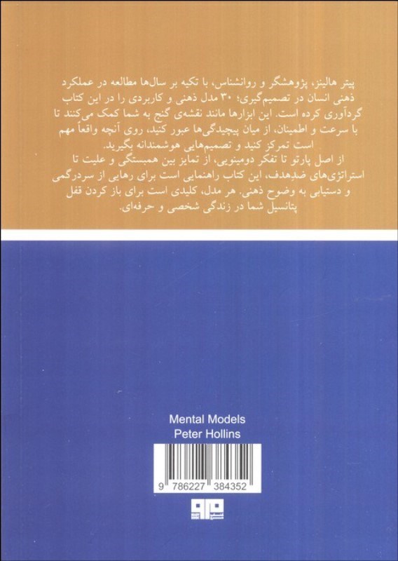 مدل هاي ذهني به نقشهي گنج براي کسي که در دل جنگل گم شده است ميمانند آنها باعث ايجاد يک درک فوري از شرايط شده و از آن مهمتر اينکه راهي براي رسيدن به مقصد نهايي فراهم ميکنند حال تصور کنيد که نقشهاي کمکي براي حل مشکلات و تصميم گيريهاي زندگيتان داشته باشيد. اين کتاب به شما کمک ميکند تا با بمباران اطلاعات مبارزه کنيد، روي آنچه که واقعا اهميت دارد متمرکز شويد و تصميمهاي مهم و پيچيده را با سرعت و اعتماد به نفس بگيريد. هر مدل ذهني يک ابزار ويژه است که کمک ميکند هوشمندانهتر و با فراست بيشتر بينديشيم. با خواندن اين کتاب ياد ميگيريم ميلياردرها، مديران موفق، ورزشکاران المپيکي و دانشمندان چطور متفاوت فکر ميکنند و ميزان خطا را به حداقل ميرسانند نويسندهي اين کتاب، پيتر هالينز دانش آموختهي رشتهي روانشناسي است. او سالها رفتارهاي انساني را مورد مطالعه قرار داده و نويسندهاي موفق و پرفروش است. او همچنين با افراد زيادي کار کرده تا پتانسيل و مسيرشان را به سمت موفقيت شکوفا کند نوشته هاي او با تکيه بر تجارب، آکادميک مربيگري و تحقيقات او طي ساليان است.