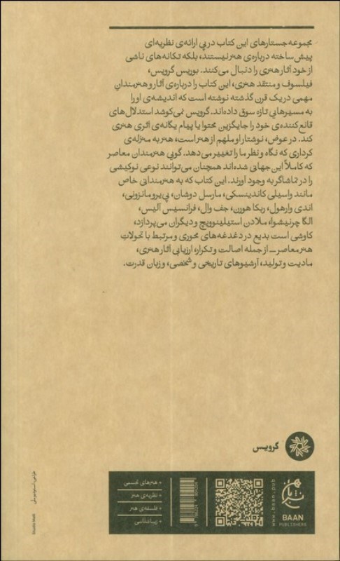 مجموعه جستارهاي اين كتاب در پي ارائه نظريه اي پيش ساخته درباره ي هنر نيستند،بلكه تكانه هاي ناشي از خود آثار هنري را دنبال مي كنند.بوريس گرويس،فيلسوف و منتقد هنري،اين كتاب را درباره آثار و هنرمندان مهمي در يك قرن گذشته نوشته است.