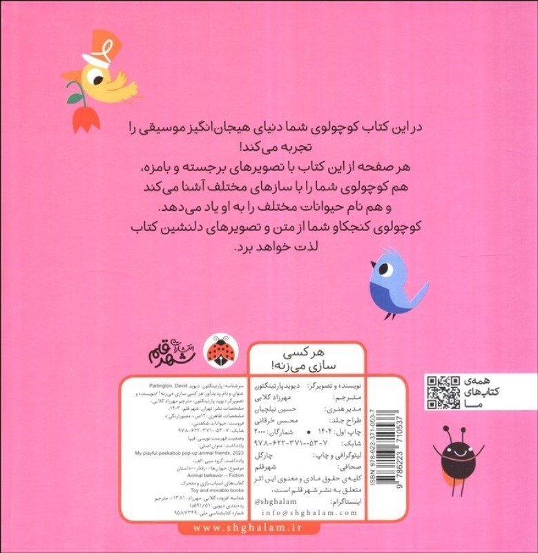 در اين كتاب كوچولوي شما دنياي هيجان انگيز كارها و عادت هاي حيوانات مختلف آشنا مي كند و هم نام حيوانات مختلف را به او ياد مي دهد.كوچولوي كنجكاو شما از متن و تصورهاي دلنشين كتاب لذت خواهد برد.