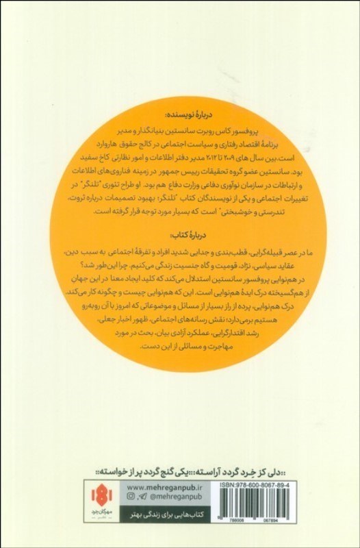 در كتاب همنوايي پروفسور سانستين استدلال ميكند كه كليد ايجاد معنا در اين جهان از همگسيخته درك ايده همنوايي است . اين كه همنوايي چيست و چگونه كار ميكند. درك همنوايي پرده از راز بسياري از مسائل و موضوعاتي كه امروز با آن روبرو هستيم برميدارد نقش رسانههاي اجتماعي ظهور اخبار جعلي رشد اقتدارگرايي عملكرد آزاديبيان بحث در مورد مهاجرت و مسائلي از اين دست.