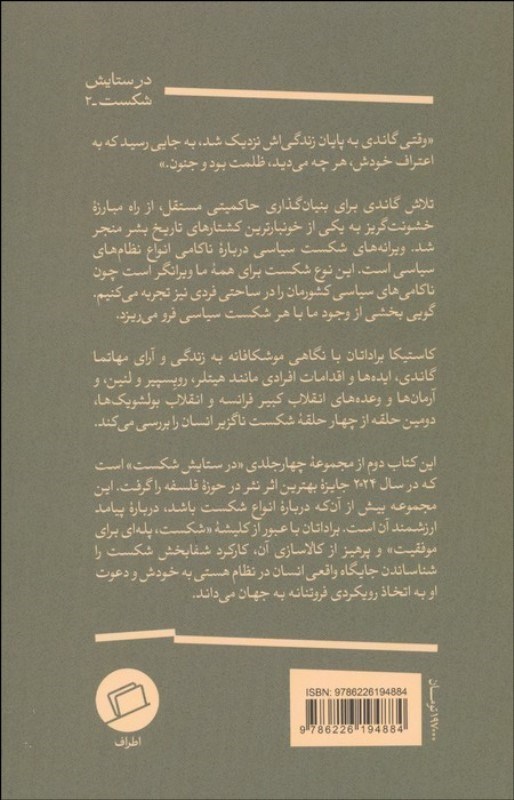 تلاش گاندي براي بنيانگذاري حاکميتي مستقل، از راه مبارز? خشونتگريز به يکي از خونبارترين کشتارهاي تاريخ بشر منجر شد. ويرانههاي شکست سياسي – در ستايش شکست (2) دربار? ناکامي انواع نظامهاي سياسي است. شکست براي هم? ما ويرانگر است چون ناکاميهاي سياسي کشورمان را در ساحتي فردي نيز تجربه ميکنيم. گويي بخشي از وجود ما با هر شکست سياسي فرو ميريزد. کاستيکا براداتان با نگاهي موشکافانه به زندگي و آراي مهاتما گاندي، ايدهها و اقدامات افرادي مانند هيتلر، روبِسپير و لنين، و آرمانها و وعدههاي انقلاب کبير فرانسه و انقلاب بولشويکها، دومين حلقه از چهار نوع شکست ناگزير انسان را بررسي ميکند.