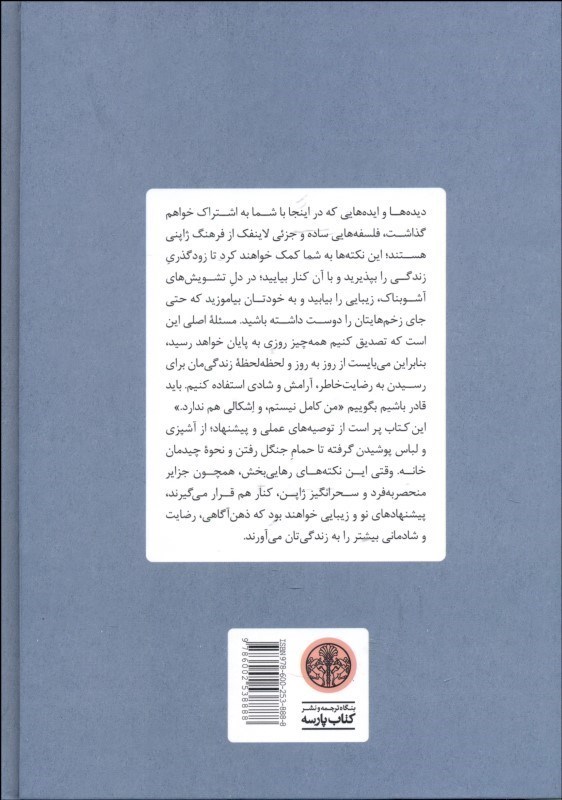 ديده ها و ايده هايي که در اينجا با شما به اشتراک خواهم گذاشت، فلسفه هايي ساده و جزئي لاينکف از فرهنگ ژاپني هستند؛ اين نکته ها به شما کمک خواهند کرد تا زودگذري زندگي را بپذيريد و با آن کنار بياييد؛ در دل تشويش هاي آشوبناک، زيبايي را بيابيد و به خودتان بياموزيد که حتي جاي زخم هايتان را دوست داشته باشيد. مسئله اصلي اين است که تصديق کنيم همهچيز روزي به پايان خواهد رسيد، بنابراين مي بايست از روز به روز و لحظه لحظه زندگي مان براي رسيدن به رضايت خاطر، آرامش و شادي استفاده کنيم. بايد قادر باشيم بگوييم «من کامل نيستم، و اشکالي هم ندارد.» اين کتاب پر است از توصيه هاي عملي و پيشنهاد؛ از آشپزي و لباس پوشيدن گرفته تا حمام جنگل رفتن و نحوه چيدمان خانه. وقتي اين نکته هاي رهايي بخش، همچون جزاير منحصر به فرد و سحرانگيز ژاپن، کنار هم قرار ميگيرند، پيشنهادهاي نو و زيبايي خواهند بود که ذهن آگاهي، رضايت و شادماني بيشتر را به زندگي تان مي آورند.