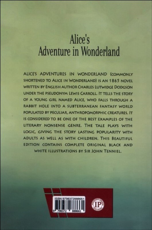 ALICE'S ADVENTURES IN WONDERLAND (commonly shortened to Alice in Wonderland) is an 1865 novel written by English author Charles Lutwidge Dodgson under the pseudonym Lewis Carroll. It tells the story of a young girl named Alice, who falls through a rabbit hole into a subterranean fantasy world populated by peculiar, anthropomorphic creatures. It is considered to be one of the best examples of the literary nonsense genre. The tale plays with logic, giving the story lasting popularity with adults as well as with children. This Beautiful edition contains complete original black and white illustrations by Sir John Tenniel.